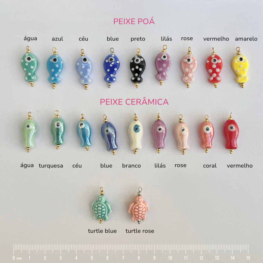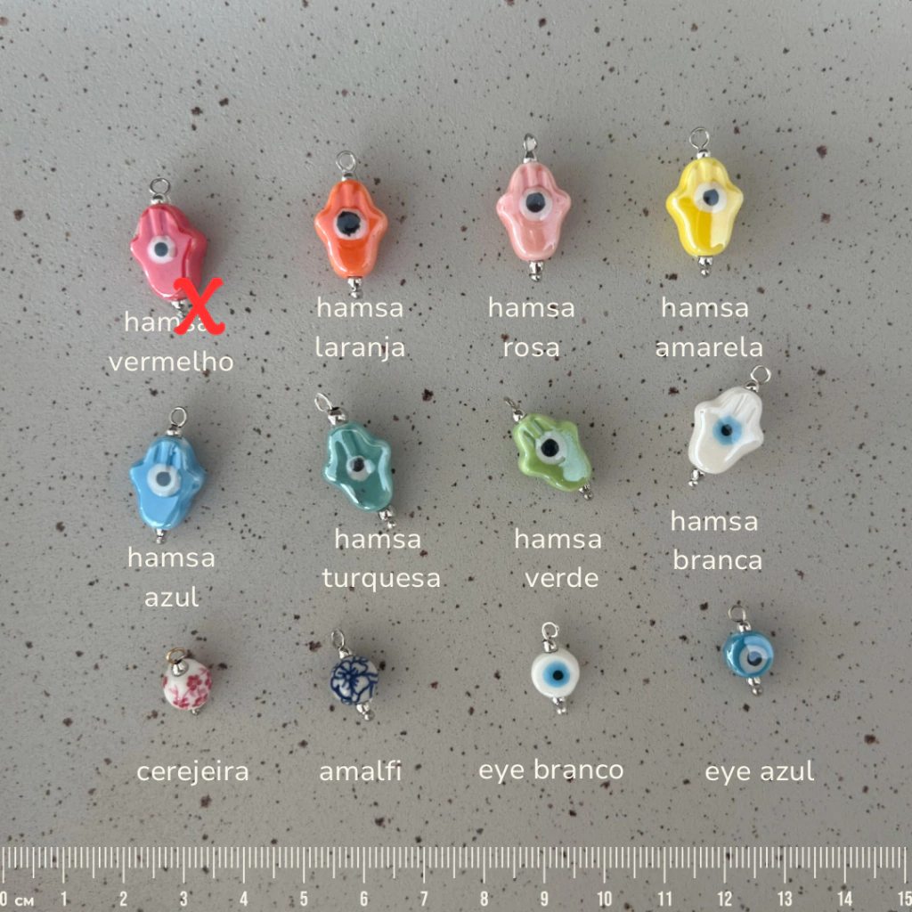 Exemplo: Se você optou por 3 pingentes, escreva: hamsa turquesa, signo áries e olho grego azul.