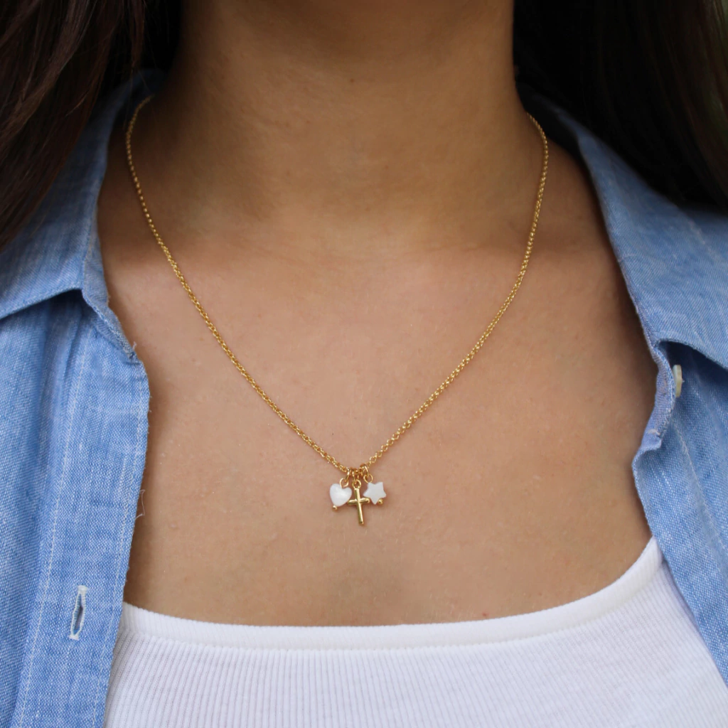 A Colar Dora Charms é banhado com Ouro 18K, o que torna essa peça uma semi-jóia de alta qualidade e durabilidade.