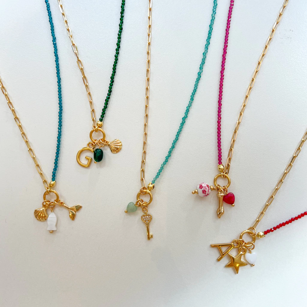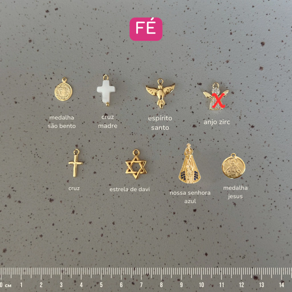 Exemplo: Se você optou por 4 pingentes, escreva: letra N, signo libra, hamsa de cerâmica e estrela.
