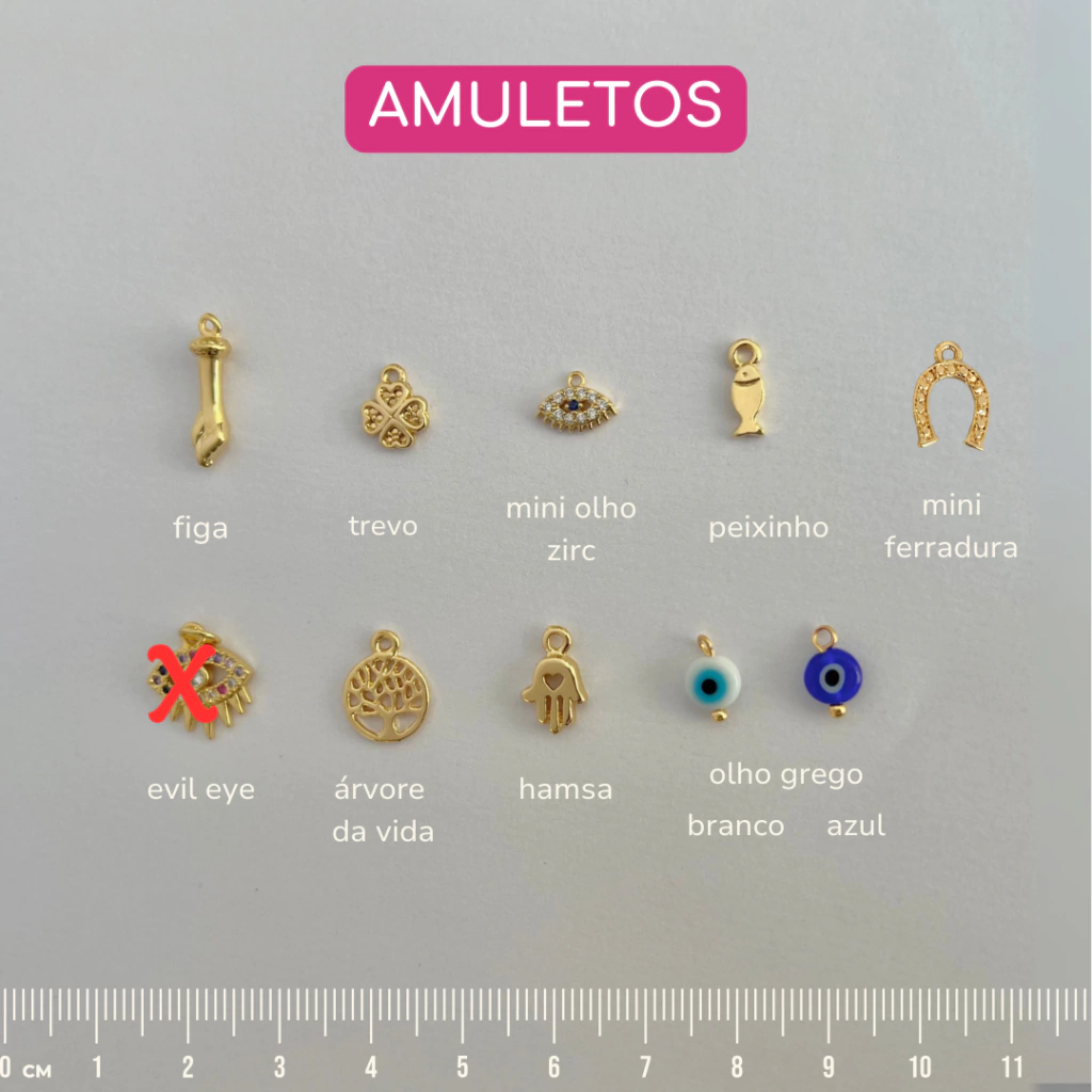 Exemplo: Se você optou por 3 pingentes, escreva: letra A, signo áries e olho grego azul.