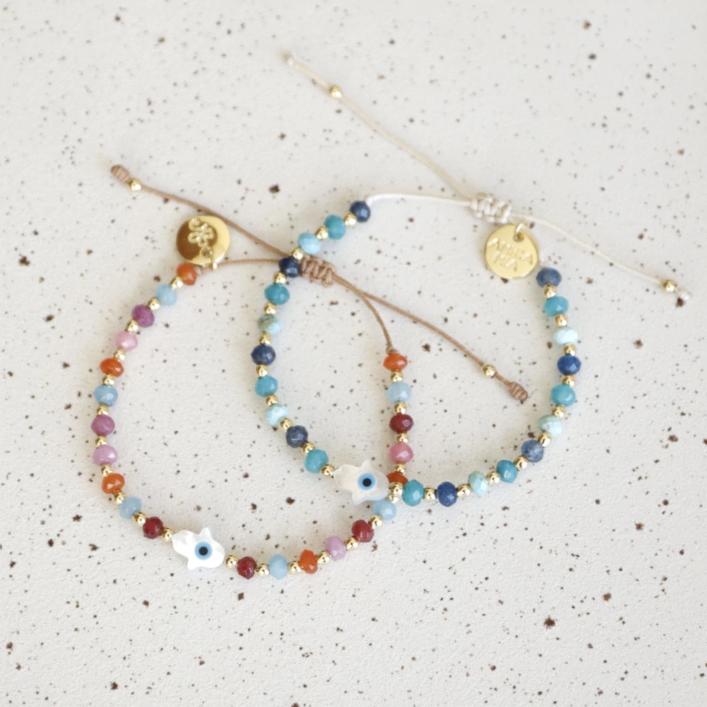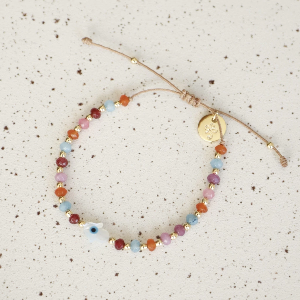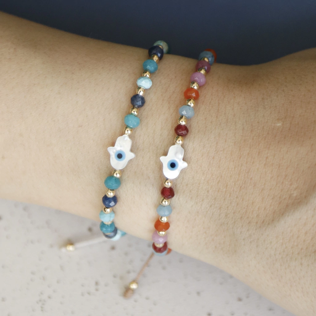 Hamsá ou Mão de Fátima, essa pulseira combina tons quentes ou frios com uma hamsá de madrepérola ao meio.
