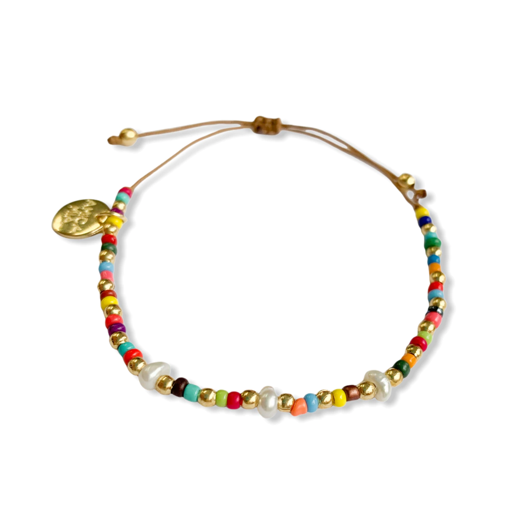 Pulseira com miçangas de vidro coloridas e perolinhas naturais de água doce. Os acabamentos metálicos recebem 5 camadas de Ouro 18k, que garantem alta qualidade e durabilidade.