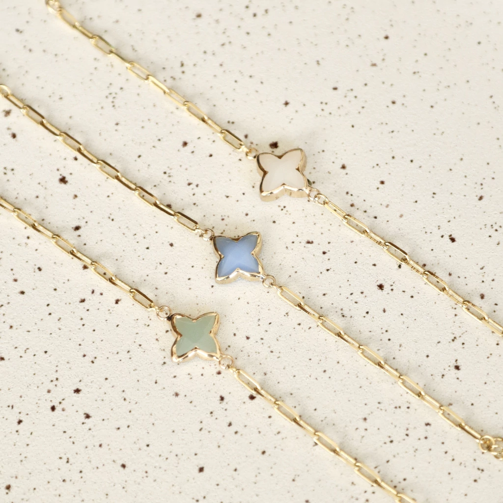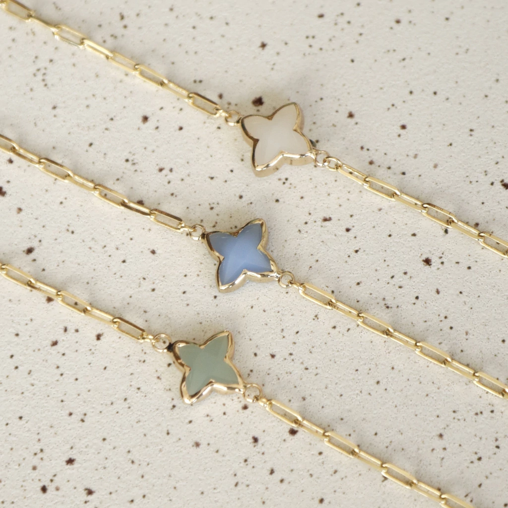 A pulseira Shine possui banho de ouro 18k e estrela de quartzo verde, azul ou branco.