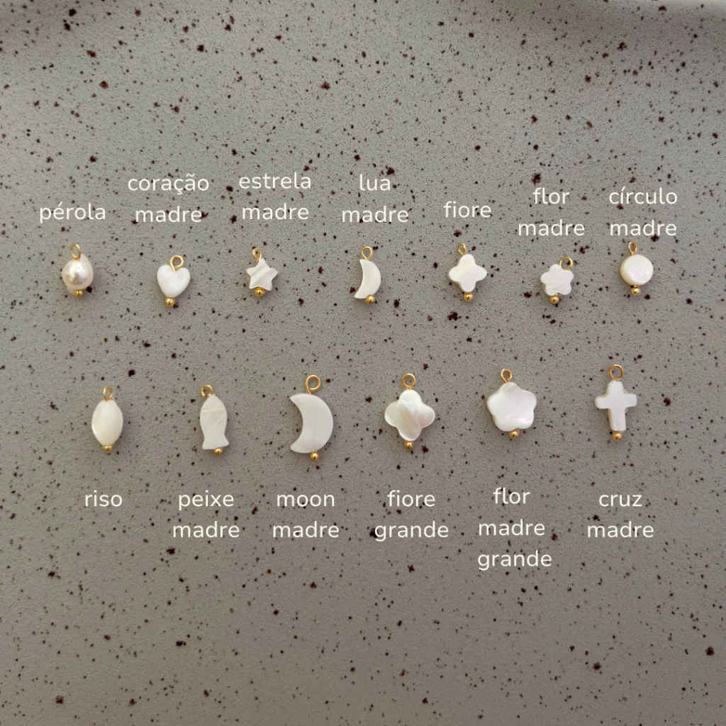 O material dos pingentinhos varia de acordo com cada um: banhados a Ródio Branco, pedras naturais, aço inox, murano, madre pérola.