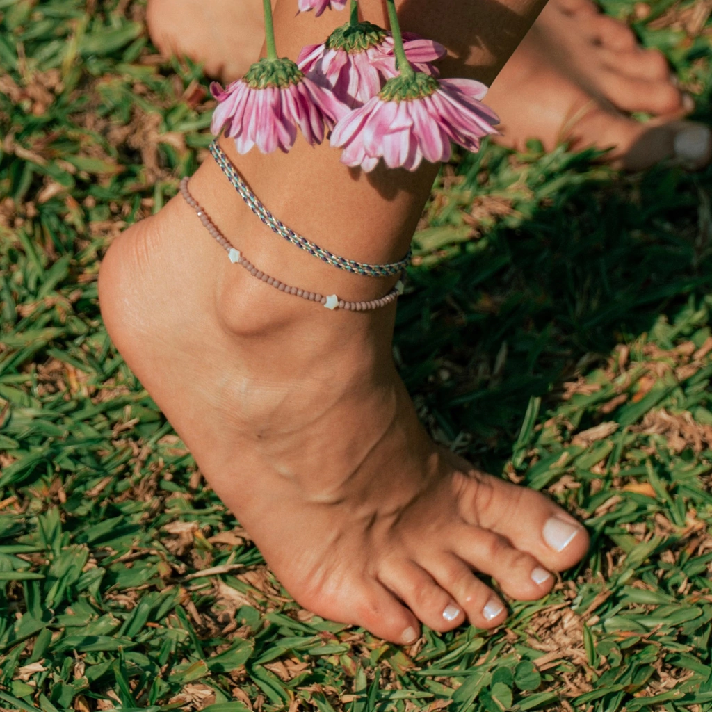 Tornozeleira de fios duplos de algodão trançados. Predominância na cor roxa com toques em azul, rosinha e brilhinhos dourados.
